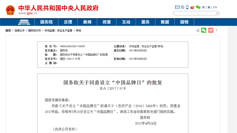 日前,国务院决定:自2017年起,将每年5月10日设立为“中国品牌日”。消息一经传出,舆论一片欢呼。品牌建设第一次上升到国家层面,中国品牌可望快速发展,品牌强盛指日可待。